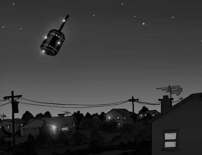 When I was twelve years old, I saw an object of some kind from a second-story window. It was at night, and it was hovering above the neighborhood. It was cylinder-shaped and seemed close; it was maybe the size of a van. It was easy to see, and it looked like black metal with lights around its surface. It moved in a slow, eerie way that doesn’t match anything that could be in the sky. It might have been about the size of a tennis ball held at arm's length. I watched it with a friend for about thirty seconds, and it disappeared. Like, blink—gone.